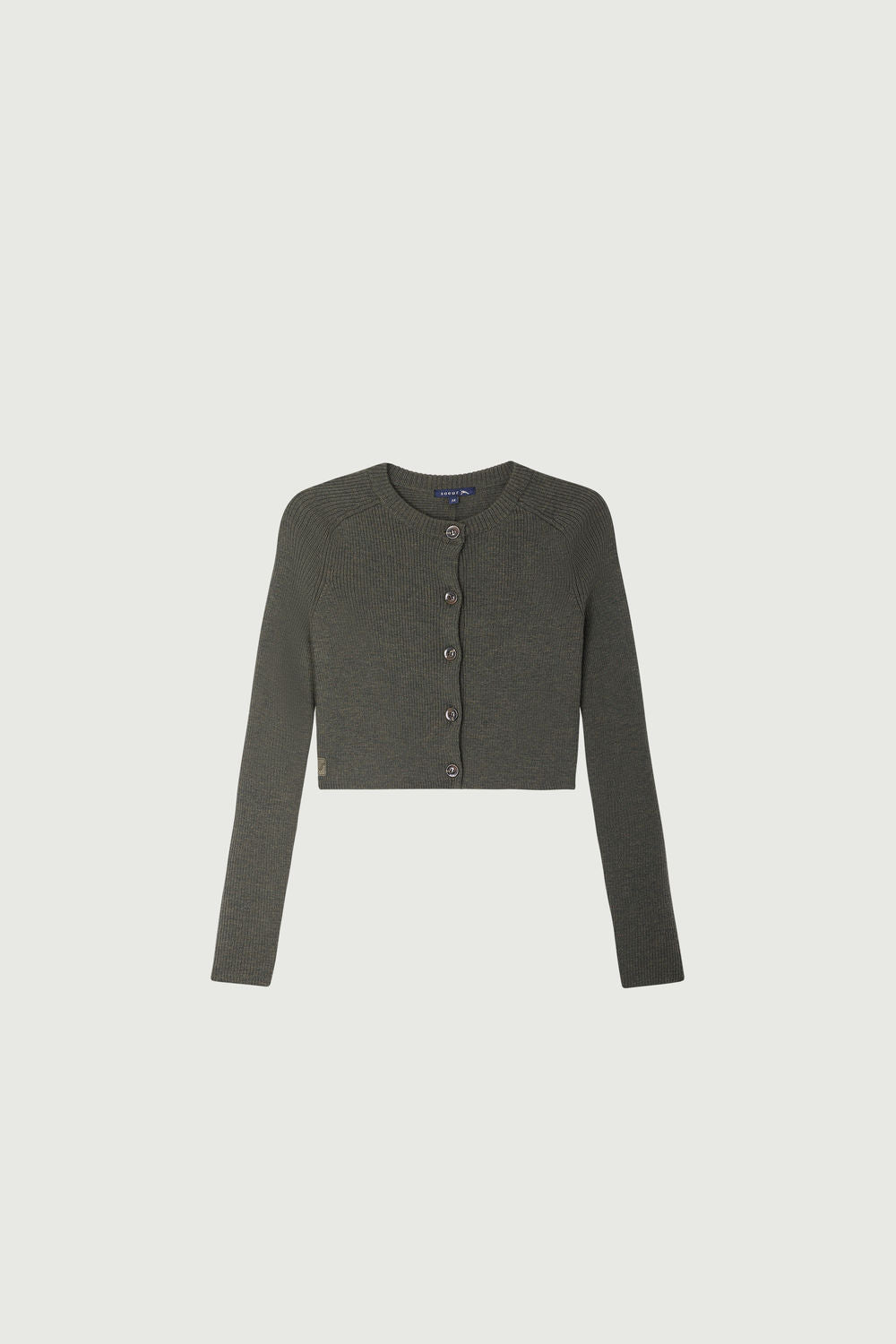 WALDEN is a ribbed stretch knit cardigan with a cropped cut. It can be worn directly on the skin or layered over a long shirt. It is part of our line of knits embroidered with the "S" monogram. This version is made from fine and warm merino wool.