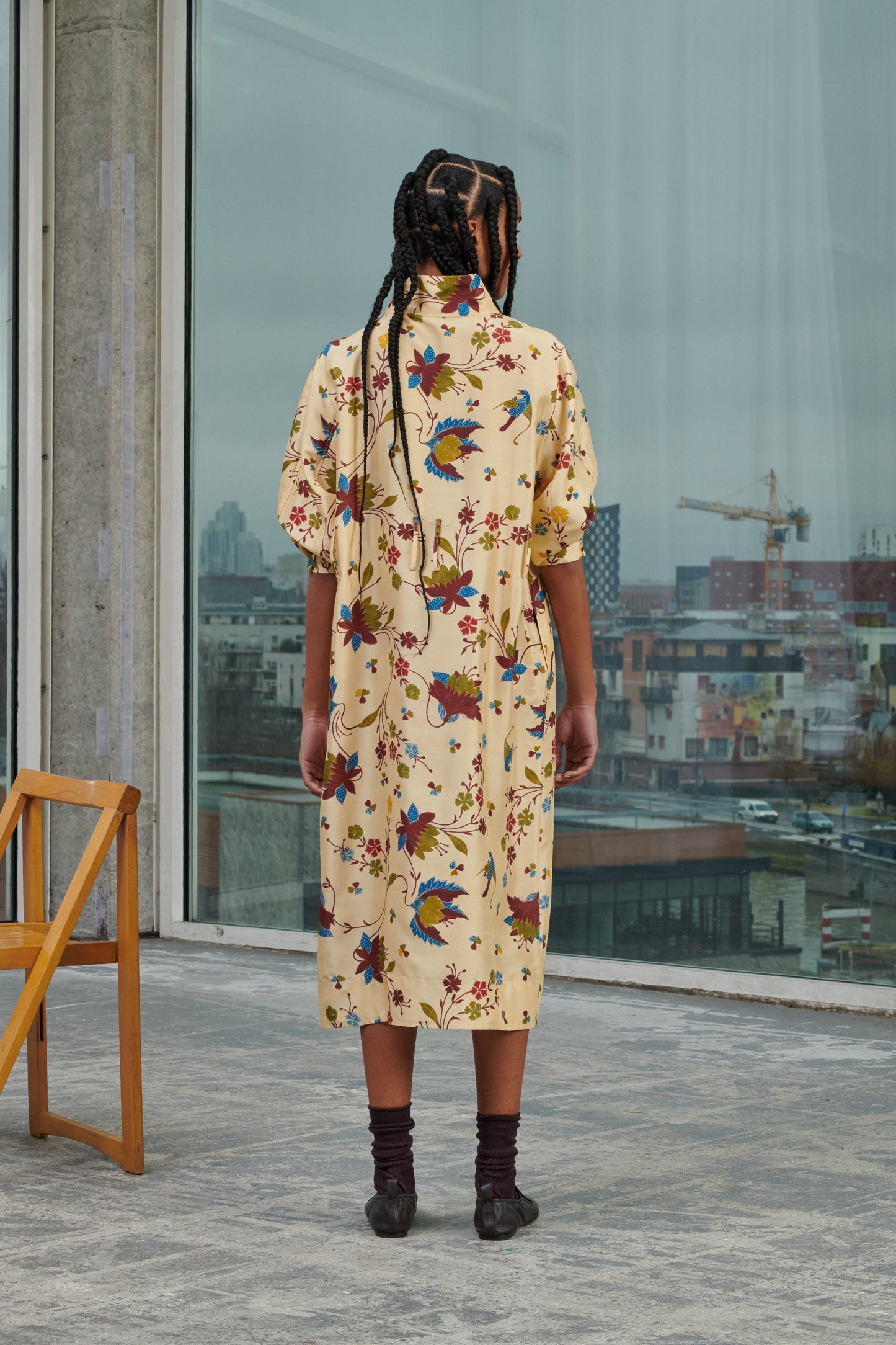 Dress with ties in printed silk doupion multico off-white